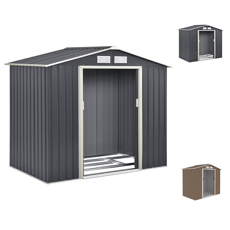 Metāla instrumentu šķūnis ar divslīpju jumtu - ideāla vieta dārza instrumentu vai mēbeļu glabāšanai. Saliekamajā šķūnī ir pietiekami daudz vietas lāpstu, puķu podu, dārza šļūteņu vai pat automašīnu riepu uzglabāšanai. Glabājamie priekšmeti būs pasargāti no sliktiem laika apstākļiem un paliks tīri. Metāla pamatne ir piestiprināta pie grīdas rāmja, lai nodrošinātu ilgstošu izturību. Viegla un stabila lokšņu tērauda konstrukcija izturēs pat sliktākos laika apstākļus, kā arī tā ir izturīga pret skrāpējumiem un rūsu. Metāla saliekamo šķūni ir ļoti viegli kopt, vienkārši nomazgājiet to ar šļūteni un gatavs! Šķūnim ir slīps jumts, kas neļauj ūdenim uzkrāties uz tā. Divdaļīgās bīdāmās durvis ir ērtas pat lielu priekšmetu ienešanai un iznešanai. Šķūnim ir četras ventilācijas atveres, kas nodrošina pastāvīgu gaisa cirkulāciju.
