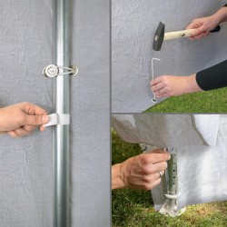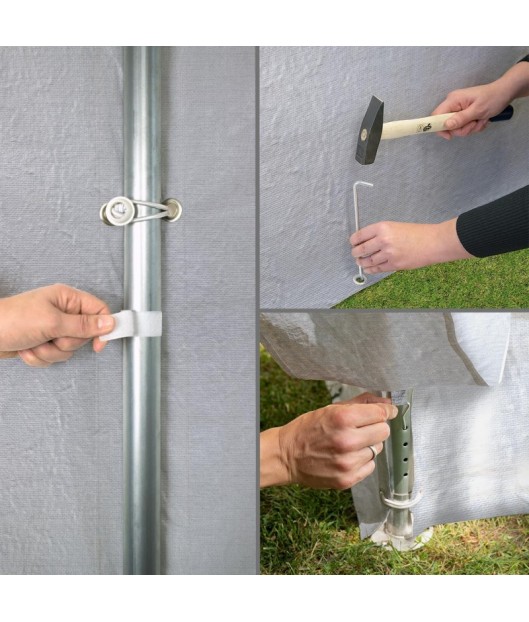 Komplekts ietilpst tapas drošai piestiprināšanai pie zemes, kā arī montāžas instrukcija. Tas ļauj ātri un viegli samontēt telti. Ar uzglabāšanas garāžas-telti jūs gūsiet labumu no 30 gadu pieredzes telšu ražošanā.