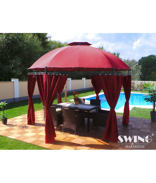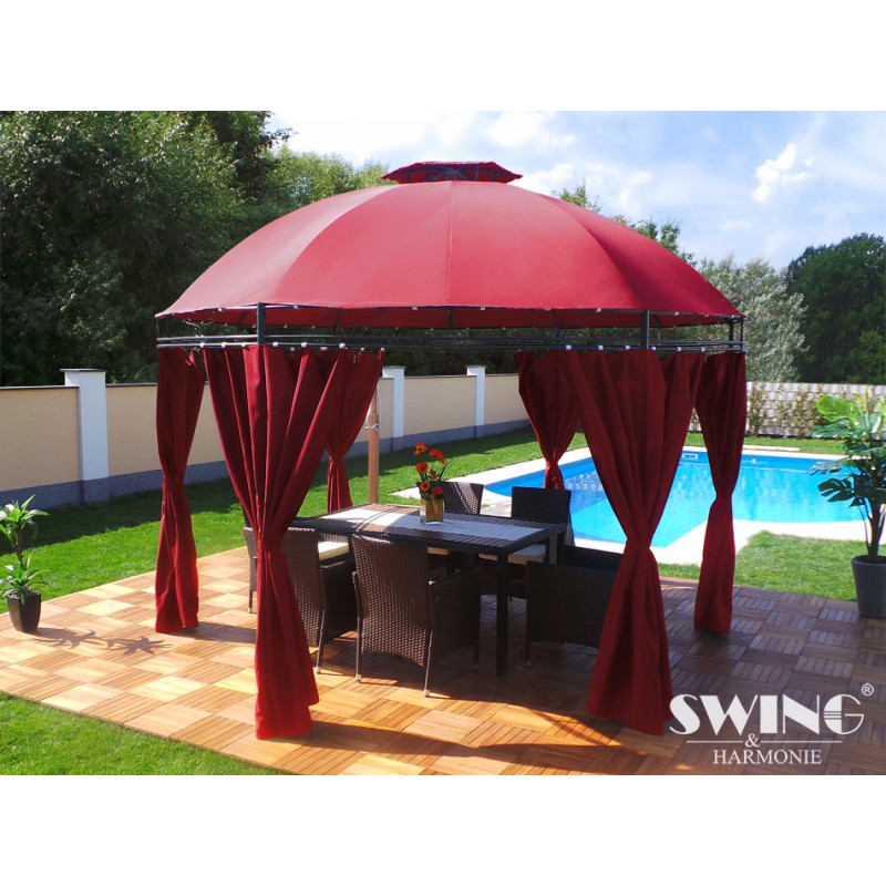 Pulverkrāsotais nojumes rāmis ir dekorēts ar grezniem rotājumiem, piešķirot dārza nojumei izteiksmīgu dizainu un greznību.