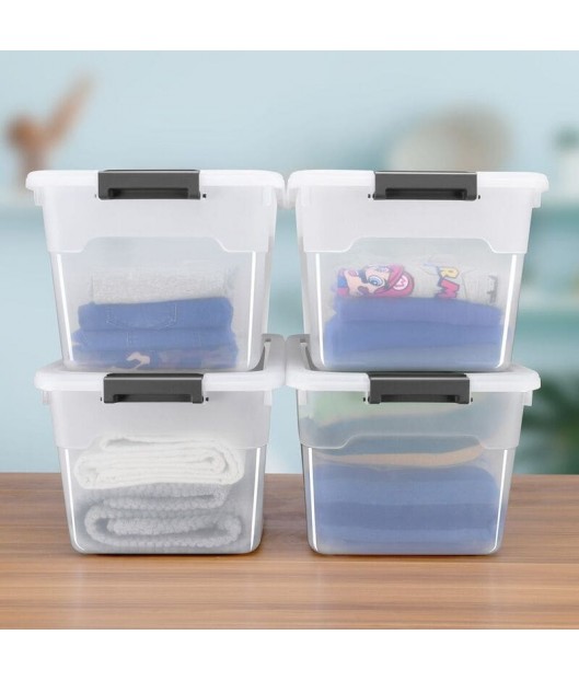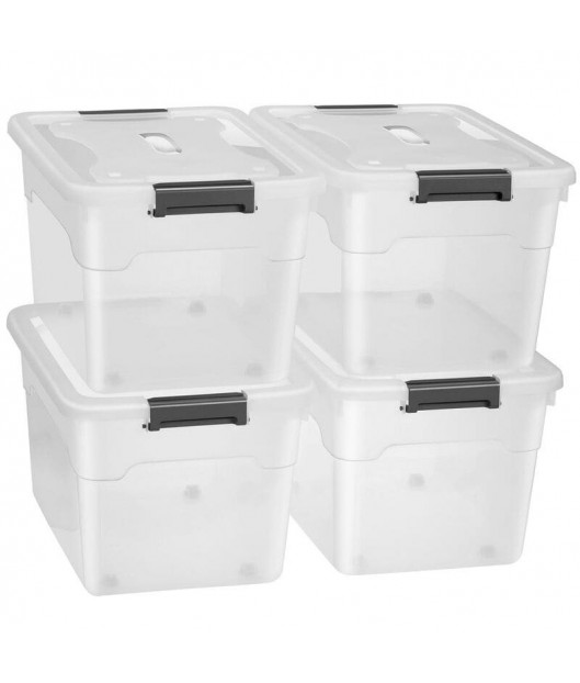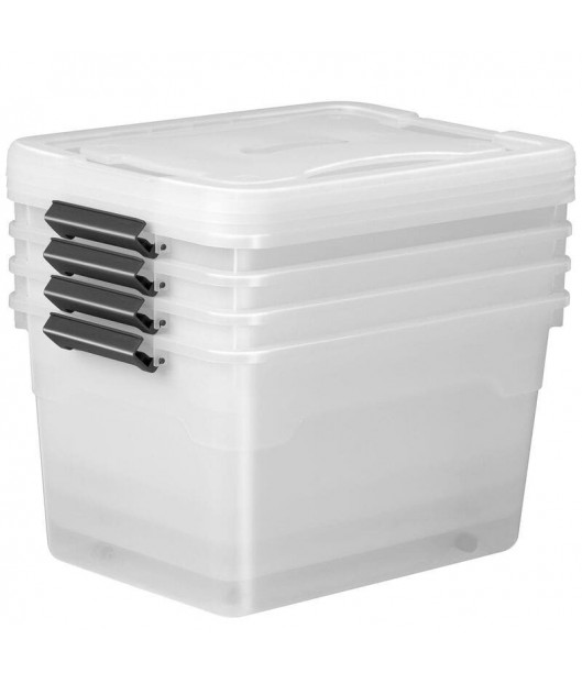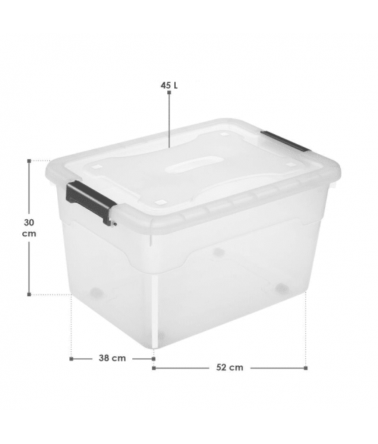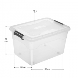 Saglabājiet kārtību ar plastmasas mantu glabāšanas kastēm. Izturīgajās plastmasas kastēs ar vākiem ir ērti glabāt sadzīves priekšmetus, rotaļlietas vai svētku rotājumus. Turklāt priekšmeti, kas atrodas puscaurspīdīgajā kastē, vienmēr ir labi redzami. Kastes ar sānu rokturiem ir neslīdošas, tās var salikt viena uz otras un viegli tīrīt. Jūs varat izvēlēties 45 vai 60 litru tilpumu ar četram vai sešam kastēm komplekta.