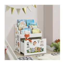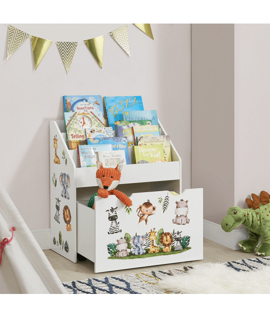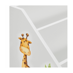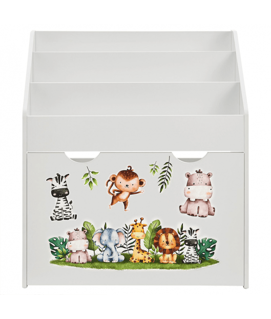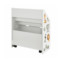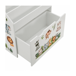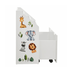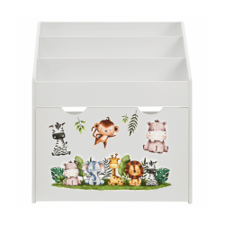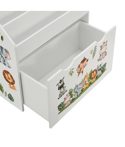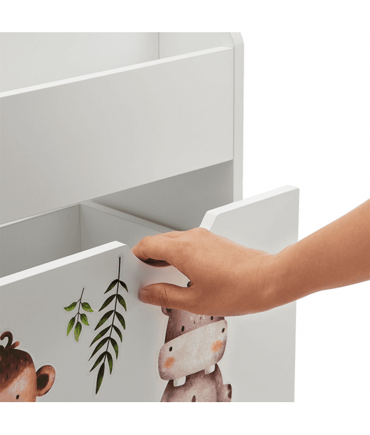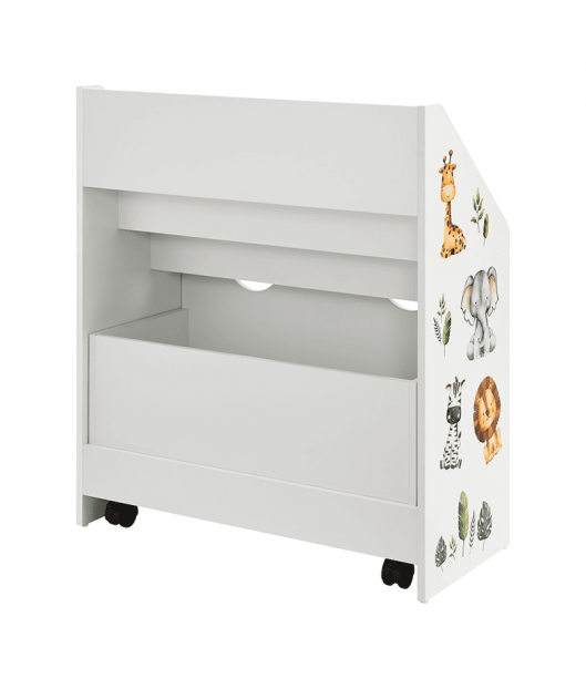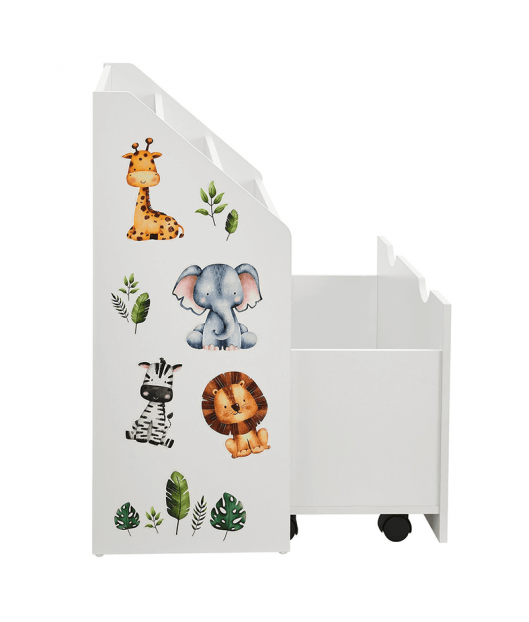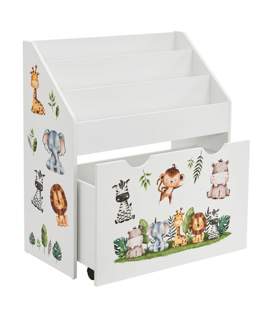 Bērnu grāmatu plaukts ar 3 nodalījumiem un atvilktni varēsiet kārtīgi sakārtot bērnu grāmatas un rotaļlietas. Atvilktnei ir riteņi, lai bērniem būtu viegli to izvilkt. Izturīgais koka plaukts ievieš kārtību bērnu istabā vai viesistabā. Tajā pašā laikā tas rotaļīgi veicina bērna attīstību. Grāmatu plauktā, kas paredzēts mazajiem, bērni pirmo reizi iemācās rīkoties ar grāmatām, proti, kā tās patstāvīgi izvēlēties un sakārtot. Turklāt jaukie dzīvnieku uzlīmes iedvesmo un attīsta iztēli. Aizmugures drošības mehānisms nodrošina stabilitāti un drošību. Gludi noapaļoti stūri ir bērniem droši.